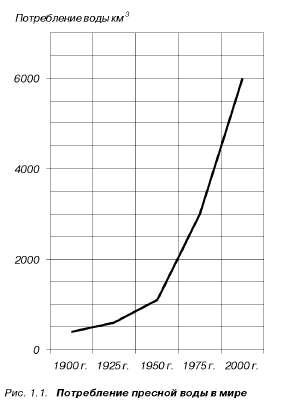 Вода – драгоценный дар природы, обеспечивающий жизнь на Земле. Естественное распределение ее запасов не очень удобно для человека; большую часть водной массы составляют соленые моря и океаны. Пресная вода доступна нам далеко не вся: значительная ее часть «законсервирована» в виде льда или таится глубоко под землей. Лишь доли процента земных ресурсов пресных вод имеются в нашем распоряжении. Положение осложняется тем, что все больше растет потребность в воде и все больше ее расходуется. В 1900 году потребление воды в мире составляло 400 км3. По прогнозам на 2000 год потребление воды достигнет 6000 км3 (рис. 1.1).
