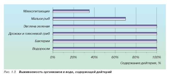 Открытия последних лет показали, что тяжелая вода играет немалую роль в биологических процессах. Это и понятно, ведь она является постоянной и повсеместной примесью природных вод. Систематическое изучение ее воздействия на животных и растения начато сравнительно недавно. Различные исследователи независимо друг от друга установили, что тяжелая вода действует отрицательно на жизненные функции организмов; это происходит даже при использовании обычной природной воды с повышенным содержанием тяжелой воды (рис. 1.3).